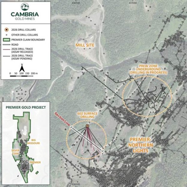 Cambria Gold Mines announced the first results from its ongoing infill drilling at the Premier Gold Project (PGP), located in northwestern British Columbia. Cambria Gold Mines began trading on February 13, 2026. Cambria’s short and long-term business objectives involve the synchronised development of two lead assets in BC’s Golden Triangle.
